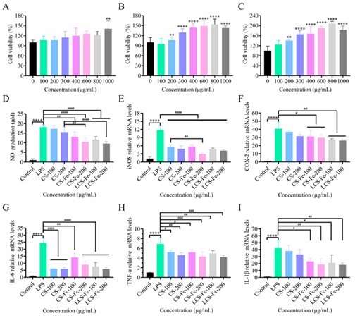采用MTT法评估CS、CS-Fe、LCS-Fe对RAW264.7细胞的安全性,结果显示,CS在0-1000 µg/mL全浓度范围内无细胞毒性,100-800 µg/mL浓度下可显著促进巨噬细胞增殖,维持细胞正常生理状态(图4A);CS-Fe在0-800 µg/mL浓度下安全无毒性,1000 µg/mL时细胞增殖率略有下降,但无明显损伤(图4B);LCS-Fe在0-800 µg/mL浓度下对细胞无抑制作用,安全性良好(图4C)。综合细胞活力与生理状态,最终确定200 µg/mL为后续抗炎活性评价的安全作用浓度。在LPS诱导的RAW264.7炎症细胞模型中,LPS组NO生成量急剧升高,炎症反应造模成功(图4D);CS仅对NO释放表现出微弱抑制作用,而CS-Fe与LCS-Fe可显著降低NO水平,抗炎效果突出。iNOS是催化NO合成的关键限速酶,LPS显著上调iNOS基因表达,CS、CS-Fe、LCS-Fe处理后均表现为下调,其中CS-Fe抑制效果最强(图4E)。COX-2是炎症反应核心介质,LPS显著诱导其高表达,三种样品处理后均表现为下调,其中LCS-Fe对COX-2的调控更显著(图4F)。促炎因子方面,IL-6基因表达受LPS显著上调,CS、CS-Fe、LCS-Fe均呈剂量依赖性抑制趋势(图4G);TNF-α基因表达中,CS-Fe与LCS-Fe的抑制作用显著强于未修饰CS(图4H);IL-1β作为关键促炎因子,200 µg/mL LCS-Fe可使其表达水平下调 60.48%,抑制幅度最大(图4I)。整体结果证实,铁络合与低分子量修饰可显著提升CS的抗炎活性,CS-Fe与LCS-Fe可同时抑制炎症介质与促炎因子表达。