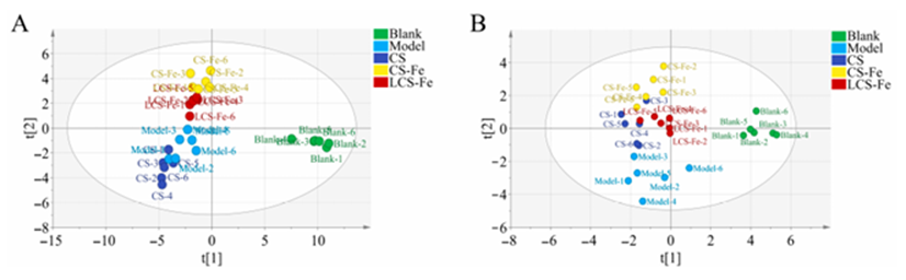 为揭示抗炎分子机制,作者采用LC-MS/MS进行靶向代谢组学分析。OPLS-DA结果显示,正离子模式下空白组与模型组沿第一主成分显著分离,LPS诱导明显代谢紊乱;CS-Fe、LCS-Fe组远离模型组,向空白组靠拢,代谢状态显著回调(图5A);负离子模式下分组趋势与正离子模式完全一致,LCS-Fe组代谢图谱最接近空白组,调控效果最优(图5B)。