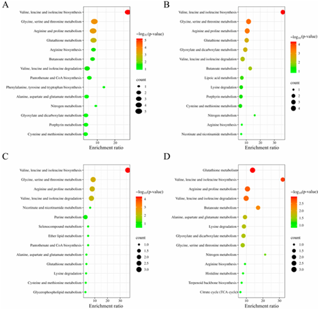 KEGG通路富集散点分析显示,空白组与模型组相比,差异代谢物显著富集于缬氨酸、亮氨酸、异亮氨酸生物合成,甘氨酸、丝氨酸、苏氨酸代谢,精氨酸、脯氨酸代谢等炎症相关通路(图6A);模型组与CS组相比,CS主要显著回调缬氨酸、亮氨酸、异亮氨酸生物合成通路,改善支链氨基酸代谢紊乱(图6B);模型组与CS-Fe组相比,CS-Fe同样核心调控缬氨酸、亮氨酸、异亮氨酸生物合成通路,回调幅度更显著(图6C);模型组与LCS-Fe组相比,LCS-Fe不仅强效逆转支链氨基酸合成通路,还可显著调控谷胱甘肽代谢通路,维持细胞氧化还原平衡,这也是其抗炎活性最优的关键机制(图6D)。